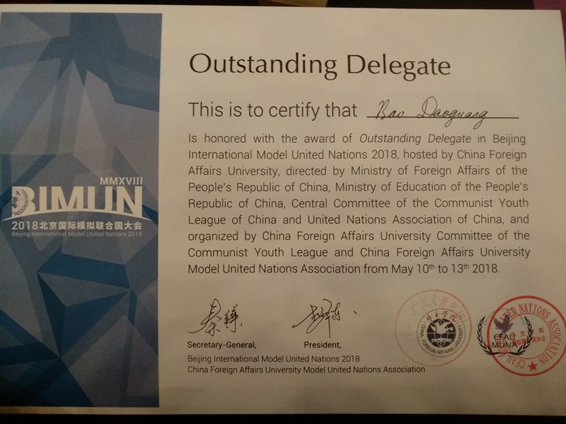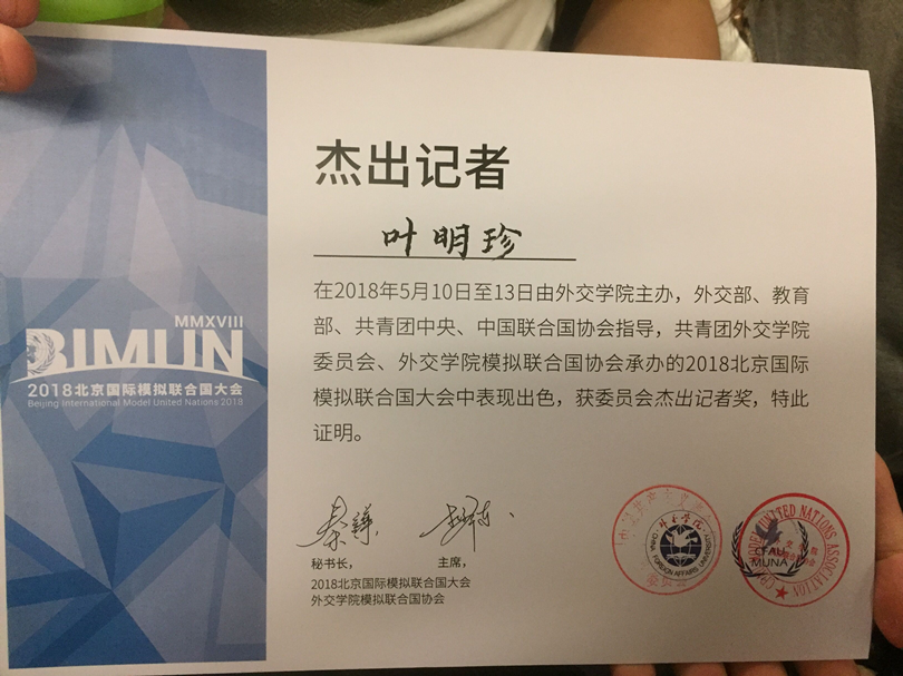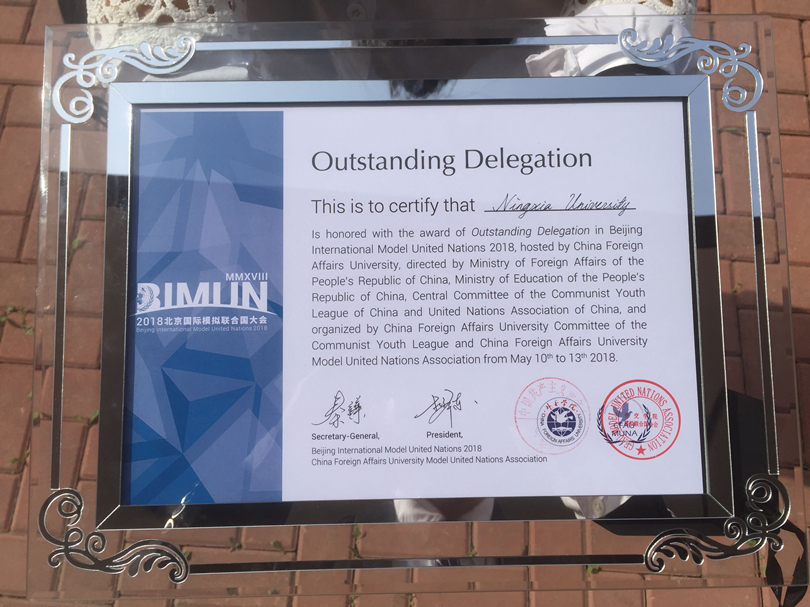 中华人民共和国外交部、教育部和共青团中央、中国联合国协会指导,外交学院主办的2018 “青年责任·共同命运”北京国际模拟联合国大会于5月13日落下帷幕。我校代表2016级政437437必赢国际网址思想政治教育专业包道广获得杰出代表奖,2016级政437437必赢国际网址思想政治教育专业叶明珍获得杰出记者奖,437437必赢国际网址获得最佳代表团奖。