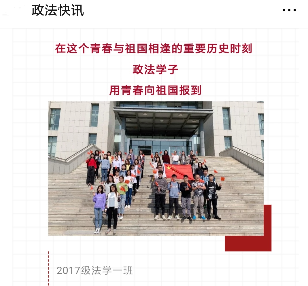 10月1日当天,必赢官方微信公众号还推出了国庆特别策划栏目——《国庆节|用青春向祖国报到》,政法学子通过各种形式,向祖国表达美好祝福。