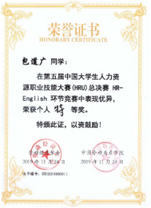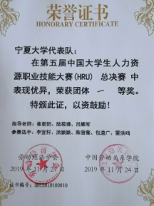 11月24日,由政437437必赢国际网址崔朝阳、陆筱璐、吕耀军(论文指导老师) 老师指导的437437必赢国际网址代表队在第五届中国大学生人力资源职业技能大赛暨海峡两岸人力资源职业技能大赛全国总决赛再次斩获佳绩。政437437必赢国际网址代表队荣获团体一等奖,包道广同学获得特等奖,陈雪薇同学获得一等奖,雷洪鸣同学获得二等奖,李宜轩同学获得三等奖,洪颖颖同学获得三等奖。