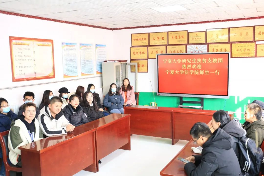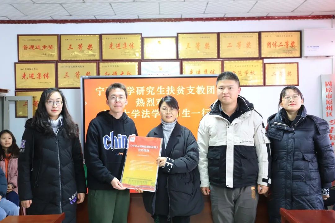 2020年12月6日,在院党委书记潘瑞的带领下,437437必赢国际网址党委副书记杨扬,教师代表张弛、刘淑媛、滕明荣、张驰、马卫军、江兆涛、王静以及部分普法志愿者同学和一名随行校医,一起前往固原市原州区头营镇马庄小学探望在那里支教的我校学生。