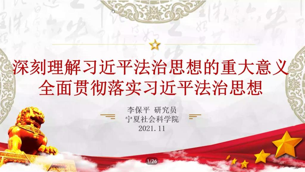 讲座主要分为三部分,第一部分“全面依法治国是国家治理的一场深刻变革”,李保平指出,法治国家建设是社会主义建设的重要前提,习近平总书记对法治的解答是全面而透彻的,从法制到法治的演变是一次法治理念和思想的解放,并尤其强调了三个核心要义、五个基本原则的重要性。第二部分“习近平法治思想是马克思主义法治理论中国化的最新成果,是习近平新时代中国特色社会主义思想的重要组成部分”,李保平强调,马克思主义法治理论的中国化本身就是一次创新,而习近平法治思想则是对马克思主义法治理论的发展,凝聚着人类法治文明的有益成果。第三部分“习近平法治思想深刻回答了新时代为什么实行全面依法治国,怎样实行依法治国等一系列重大理论与实践问题”,李保平称,习近平法治思想的产生背景是极其复杂的,是经过深思熟虑后的成果,对于解决当今社会的法治问题具有现实意义。最后,李保平指出,以习近平法治思想为指导的法治国家建设是实现第二个百年奋斗目标和中华民族伟大复兴的重要保障,也是铸牢中华民族共同体意识的有力支撑。
