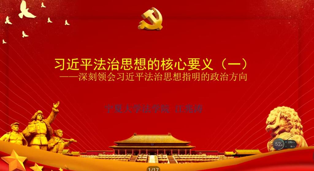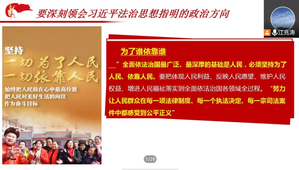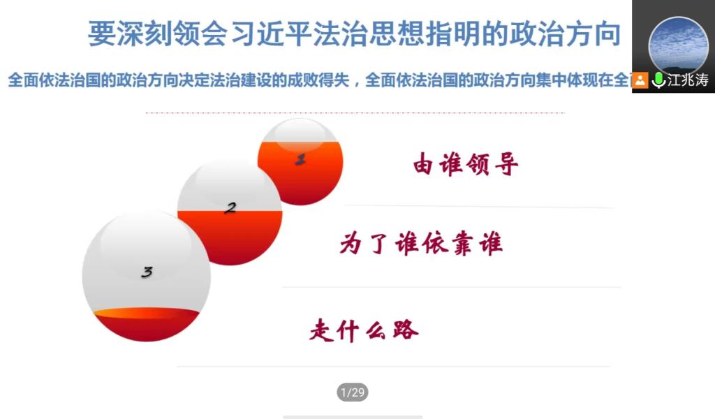 为深入贯彻落实习近平法治思想,全面做好法治人才培养工作,提高法学专业本科生思想政治素质和法治素质,437437必赢国际网址于11月10日下午组织开展《习近平法治思想概论》第三讲“习近平法治思想核心要义(第一部分)”主题线上讲座。本次讲座由江兆涛老师主讲,437437必赢国际网址副院长胡世恩、法律系主任朱蓓予和部分法律系教师出席,二百多名法学专业本科生、研究生参加学习。