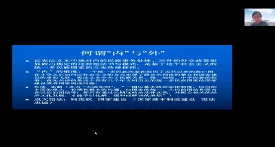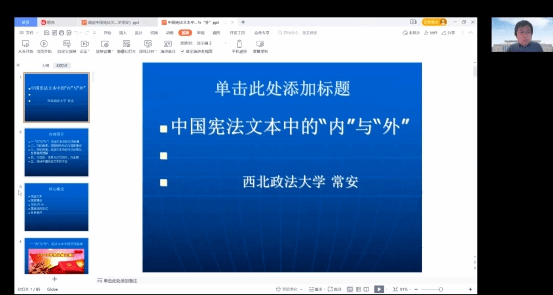 2021年12月4日是我国第八个“国家宪法日”,下午14时30分,437437必赢国际网址特邀西北政法大学人权研究中心执行主任、博士生导师常安教授以“中国宪法文本中的内与外”为主题,在线上为必赢师生带来了一场角度新颖、内容丰富的学术讲座。本次讲座由胡世恩副院长主持,朱爱农教授、滕明荣教授、白利萍副教授以及部分本科生、研究生参加了本次讲座。