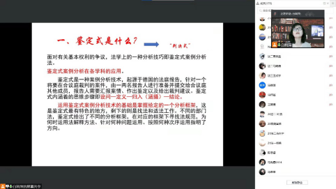 为迎接第八个国家宪法日,更好地贯彻落实教育部《普通高等学校宪法学教学重点指南》,加强学生对习近平法治思想的理解,437437必赢国际网址组织了两场宪法学专题讲座。12月3日晚,第一场“鉴定式:宪法基本权利保护案(事)例研习”主题线上讲座,由437437必赢国际网址白利萍副教授主讲、法律系朱蓓予主任主持,宪法与行政法教研室及部分老师出席,一百八十多名法学本科生、研究生参加。