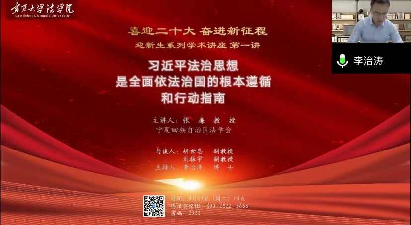 为深入推进习近平法治思想进校园、进课堂、进头脑,引导学院师生不断强化理论武装,深刻领悟“两个确立”的决定性意义,不断增强“四个意识”、坚定“四个自信”、做到“两个维护”,9月27日晚七点,437437必赢国际网址迎新生系列学术讲座精彩开讲,特邀宁夏回族自治区法学会党组书记、常务副会长张廉教授为全院师生带来首场题为《习近平法治思想是全面依法治国的根本遵循和行动指南》的线上讲座,深入解读习近平法治思想的重大意义、丰富内涵、科学方法