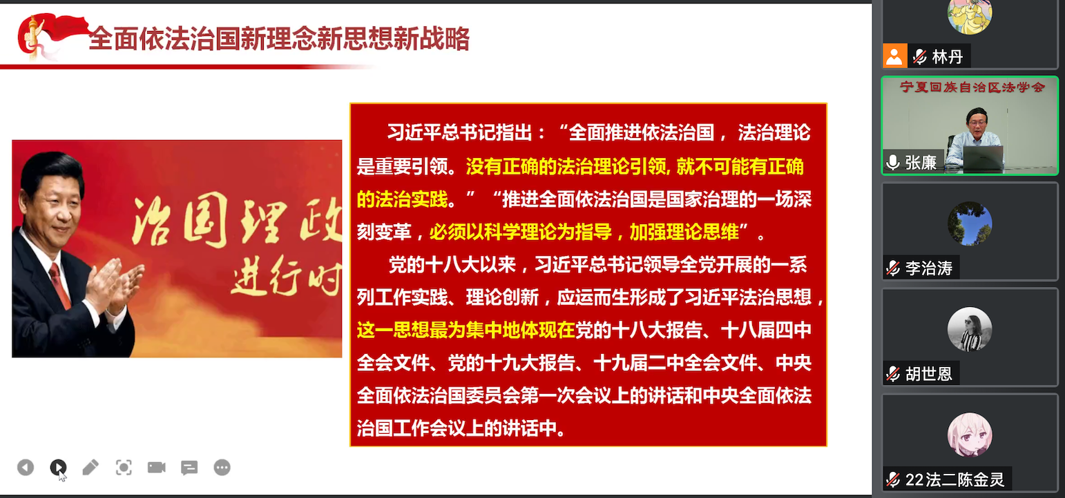 讲座以依法治国基本方略为主线,从理论逻辑、历史逻辑、实践逻辑出发,深刻阐明习近平法治思想是全面依法治国的根本遵循,结合宁夏法学会对高校法学教育的引领作用,并联系法治宁夏建设实际,深入讲解了习近平法治思想中蕴含的深邃政理、法理、学理、哲理,既有政策、理论层面的深度分析,也有制度、实践层面的详细解读。