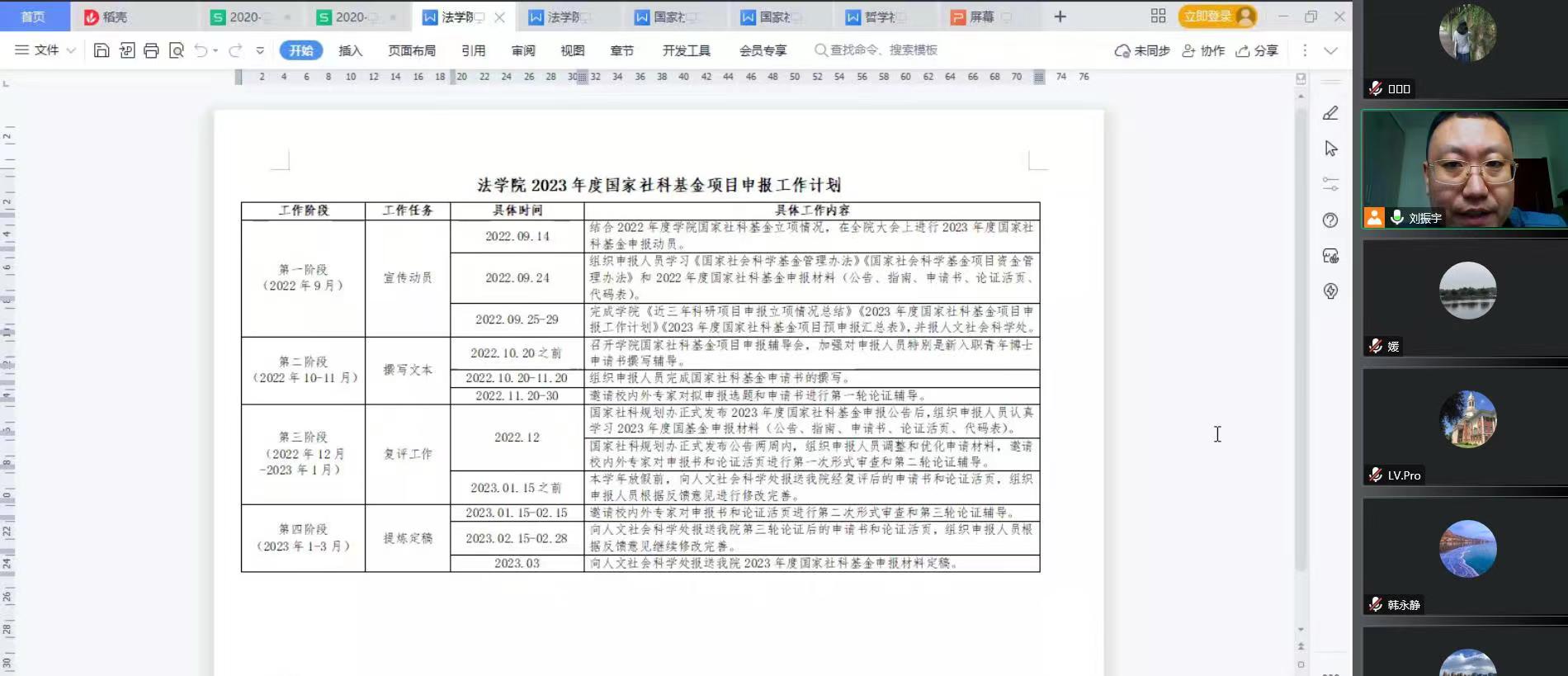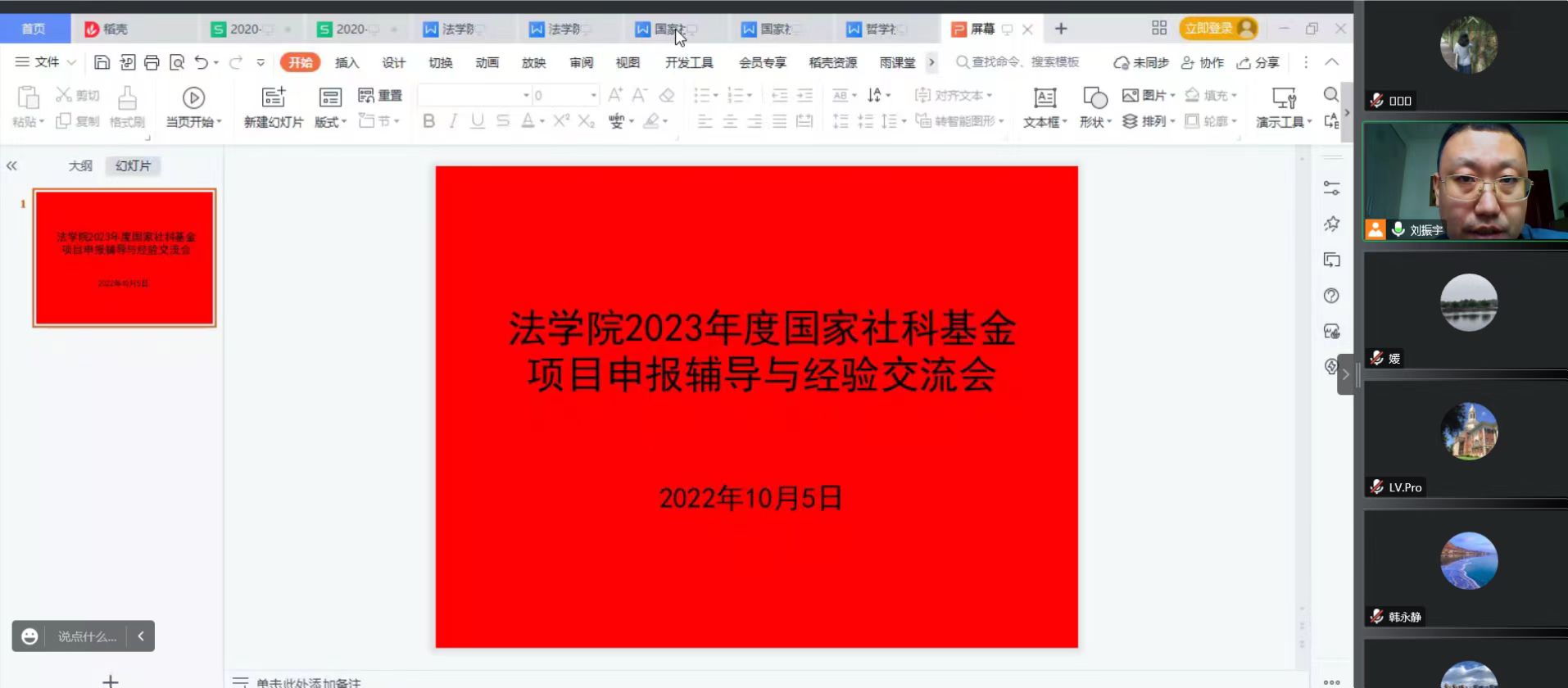 会议第一阶段,刘振宇详细介绍了《437437必赢国际网址2023年度国家社科基金项目申报工作计划》,对必赢近三年科研项目情况进行了细致分析,并解读了《国家社会科学基金管理办法》《国家社会科学基金项目资金管理办法》。通过讲解,各位老师进一步明晰了项目申报进度安排,并对国家社科基金项目有了更加深入的了解。