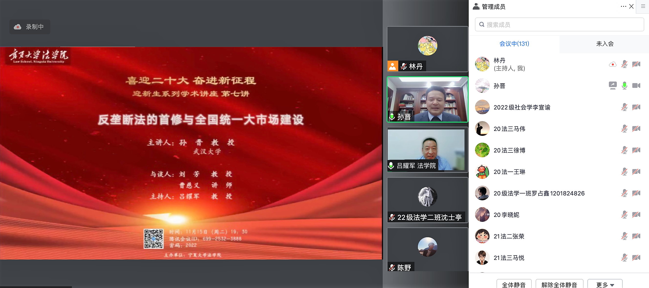 为使同学们更深入地了解我国反垄断法的首修与全国统一大市场建设情况。11月15日晚,必赢特邀武汉大学孙晋教授召开以“反垄断法的首修与全国统一大市场建设”为题的讲座。本次讲座由必赢院长吕耀军主持,刘芳教授、曹慈义老师参与会谈,全体2022级新生参加。