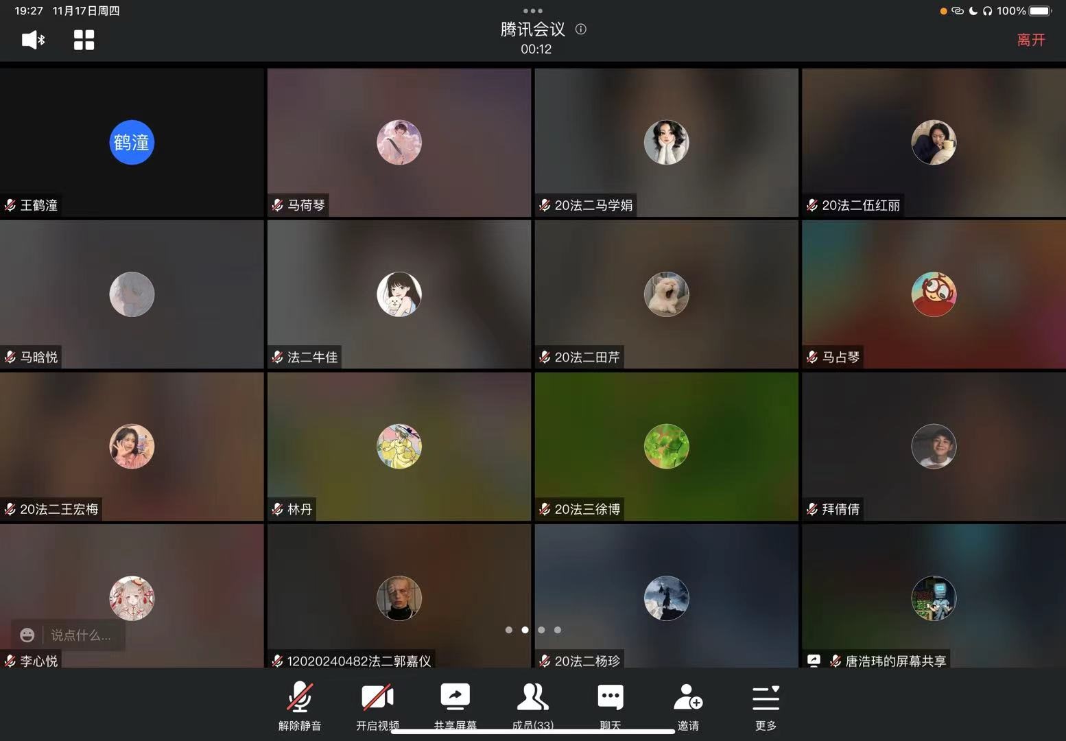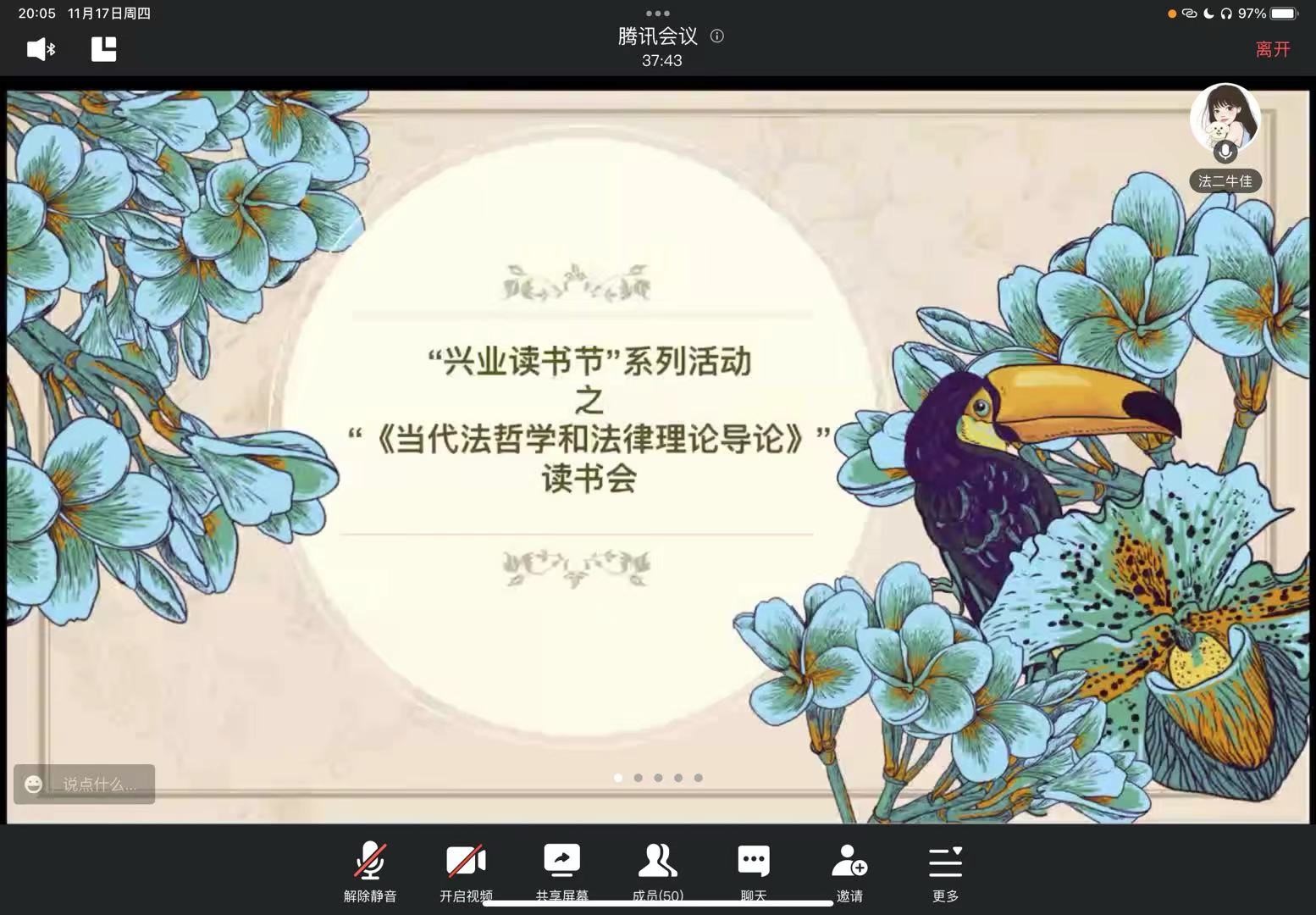 2022年11月17日晚,2020级法学二班、三班本科生举行“兴业读书节”系列活动之《当代法哲学和法律理论导论》读书会。本次读书会由必赢法律系教师何磊召集并进行总结,学生马晗悦担任报告人,唐浩玮、马玉鹏、牛佳、徐博担任点评人,两个班全体同学参加。