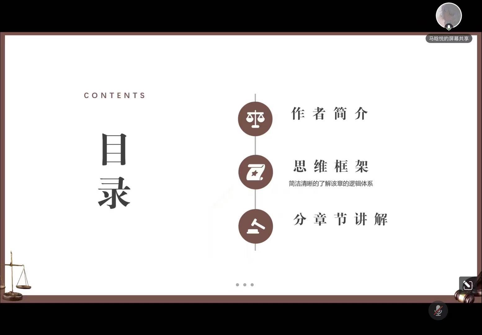 《当代法哲学和法律理论导论》这本书是由德国当代著名法学家阿图尔∙考夫曼和温弗里德∙哈斯默尔主编并携其门下与同事共同撰写的一部大学法科用书。全书共分为五部分:绪论、历史商谈、重点问题、理论阵营以及趋势。以这本书作为研读对象,能极大地提高法学生对法律和哲学两者的思考与理解。报告人马晗悦深入浅出,旁征博引,用简单易懂的语言诠释着她对这本书的理解,将听众代入她的思维当中,引发读者对法哲学的思考。