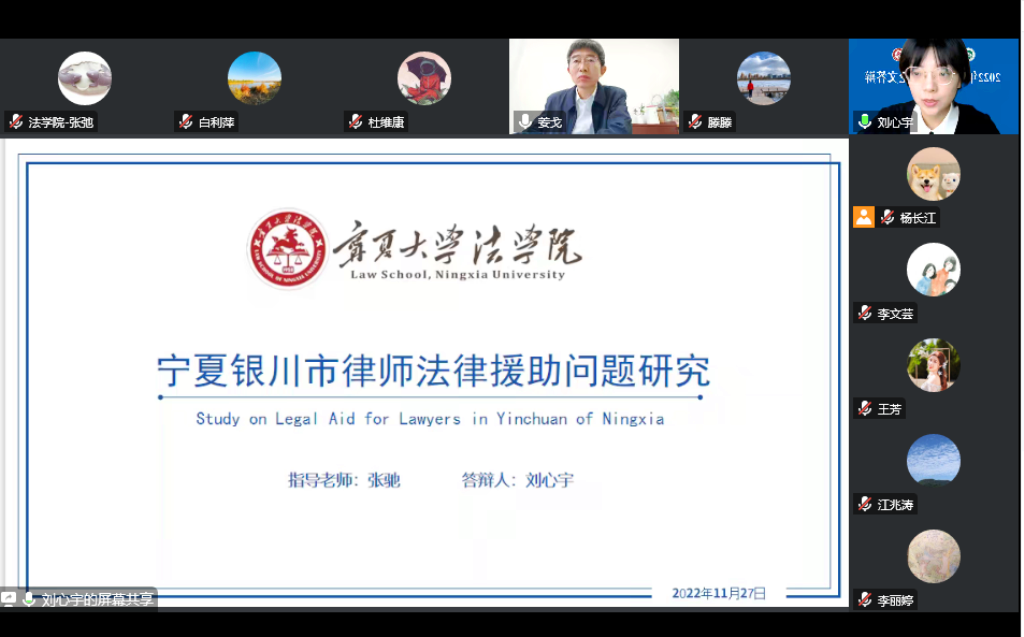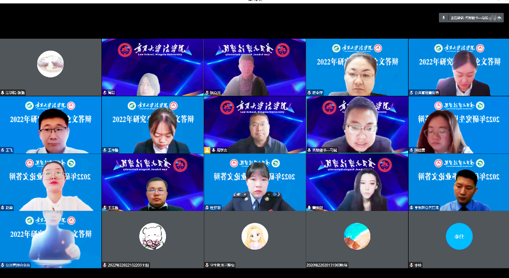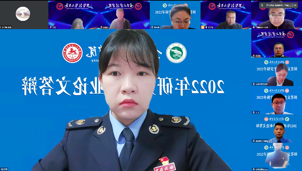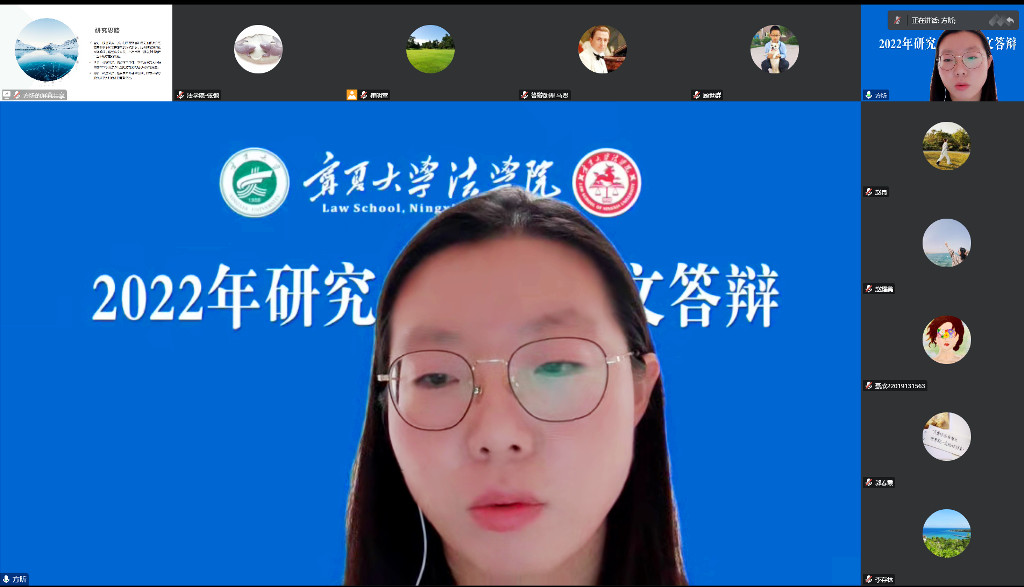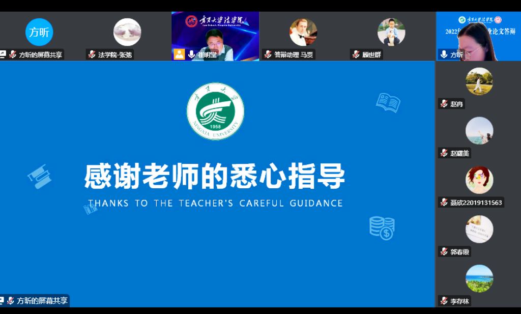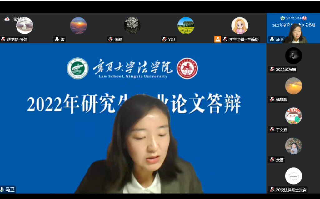 来自自治区高级人民法院、自治区司法厅、北方民族大学等单位的同行专家担任本届答辩委员会主席或委员。答辩会上,每位研究生从选题背景、研究方法与思路、研究内容、创新点及成果等方面进行了详细阐述,答辩委员会委员逐一进行点评和提问,并就进一步完善论文提出指导性意见和建议。答辩委员会认为437437必赢国际网址专业硕士研究生的学位论文选题以我区经济社会以及法治建设实际需求为背景,以问题导向开展应用研究,体现了专业硕士研究生综合运用科学理论、方法和技术解决实际问题的能力,具备了专业硕士的基本素养。