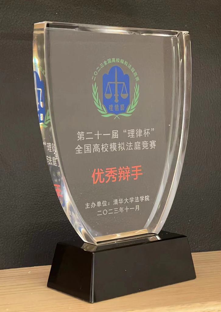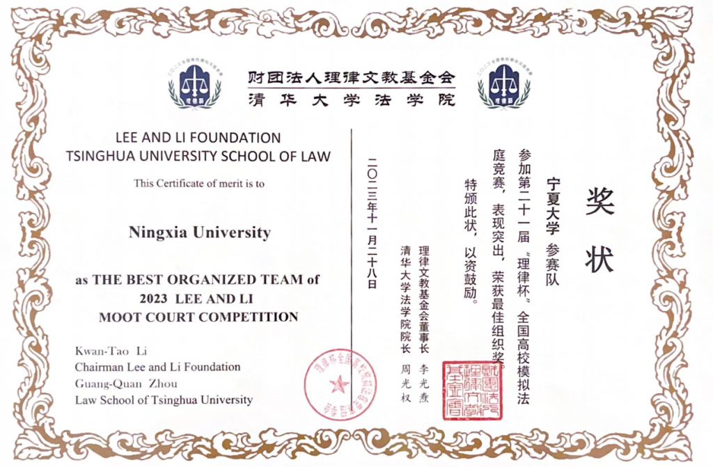 在比赛过程中,437437必赢国际网址选手们展现出的团队协作和职业素养也赢得了广泛好评。437437必赢国际网址代表队凭借着其优秀的组织能力、协作能力和参赛选手在场上有条不紊的配合,最终亦获得“最佳组织奖”的称号。秦子禄同学通过其扎实的法学功底和在模拟法庭上出色的表现,获得宁夏代表队的“最佳辩手”的称号。