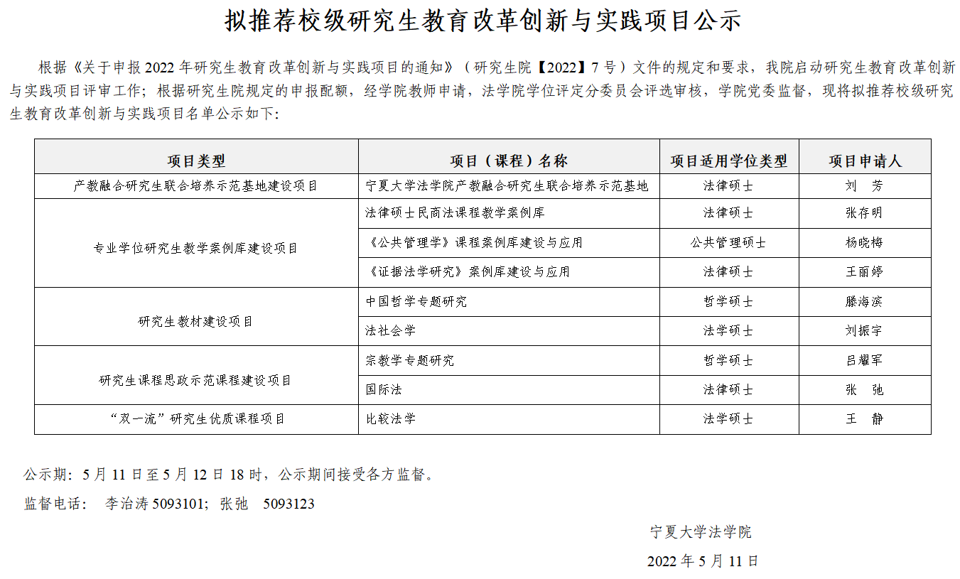 拟推荐校级研究生教育改革创新与实践项目公示
