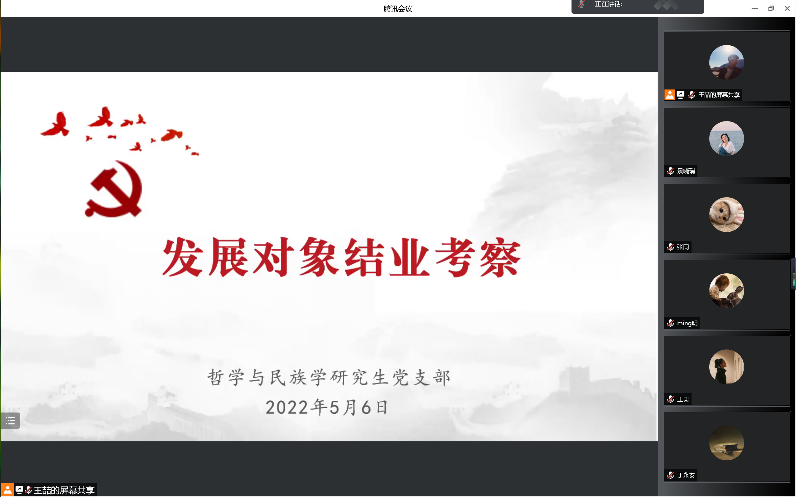 根据学院分党校培训安排,哲学与民族学研究生党支部于2022年5月6日,以线上形式开展发展对象结业考察。