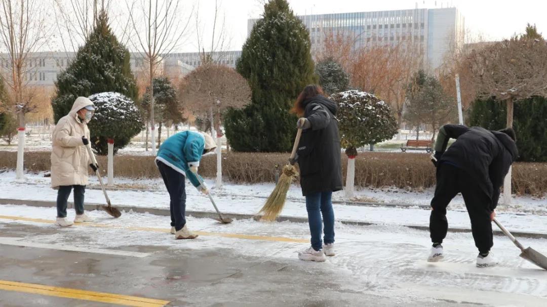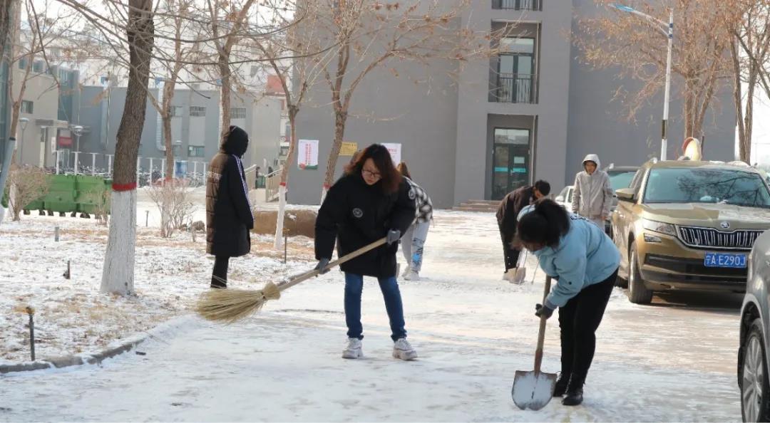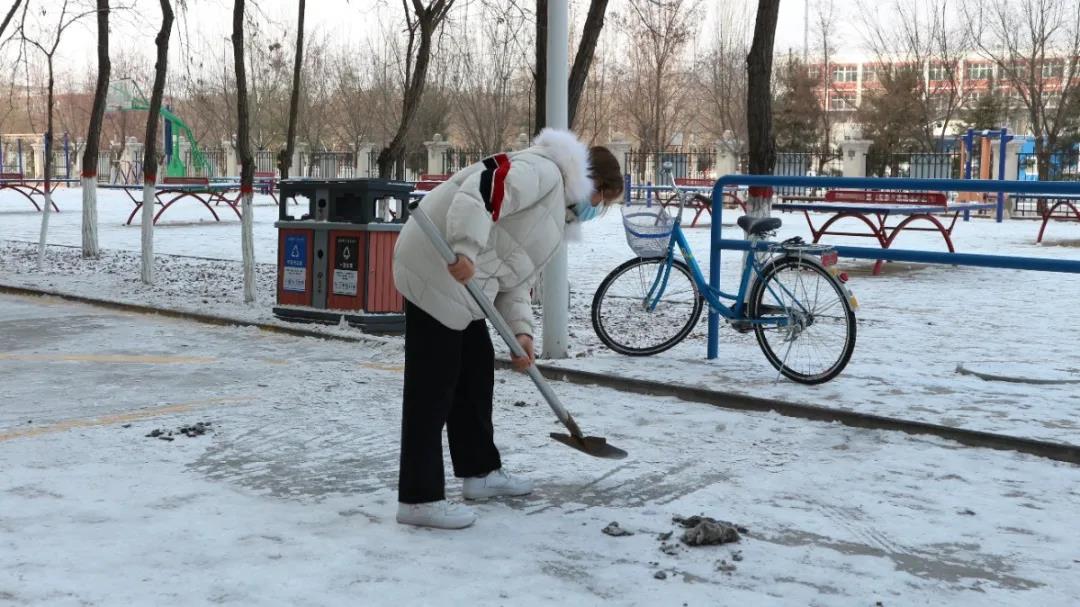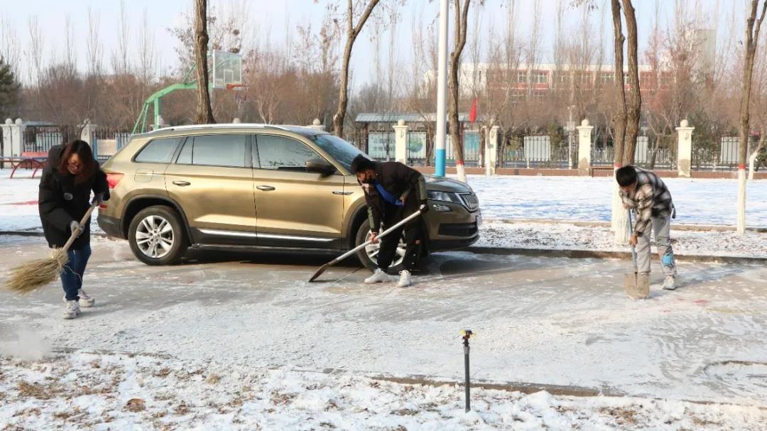大家不畏严寒,挥动铁锹,舞动扫帚,校园的各个角落都留下了同学们辛勤扫雪的身影,扫雪大军为校园增添了一道靓丽的风景线,也给寒冷的冬日校园带来了不少温暖。寒风凛冽,天冷路滑,“众人拾柴火焰高”,原本看起来十分繁重的任务在大家齐心协力的努力下高效完成。