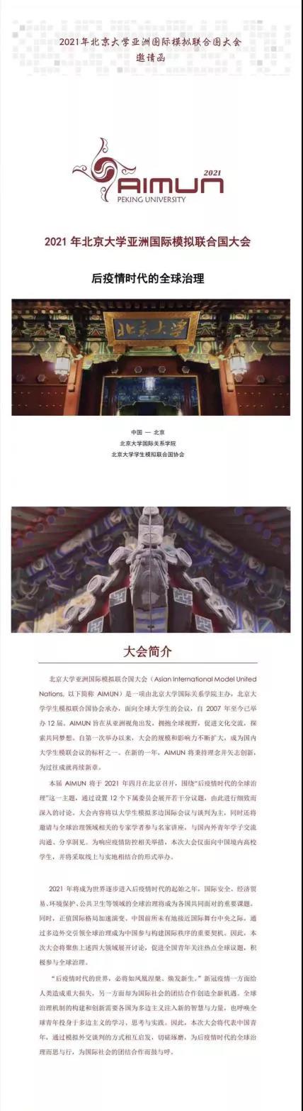 日前,由必赢4名学生及国际教育学院2名学生组成的437437必赢国际网址国际关系学会代表团,于线上参加了由北京大学国际关系学院主办的2021年北京大学亚洲国际模拟联合国大会。本届大会围绕“后疫情时代的全球治理”这一主题,旨在从亚洲视角出发,拥抱全球视野,促进文化交流,探索共同梦想。