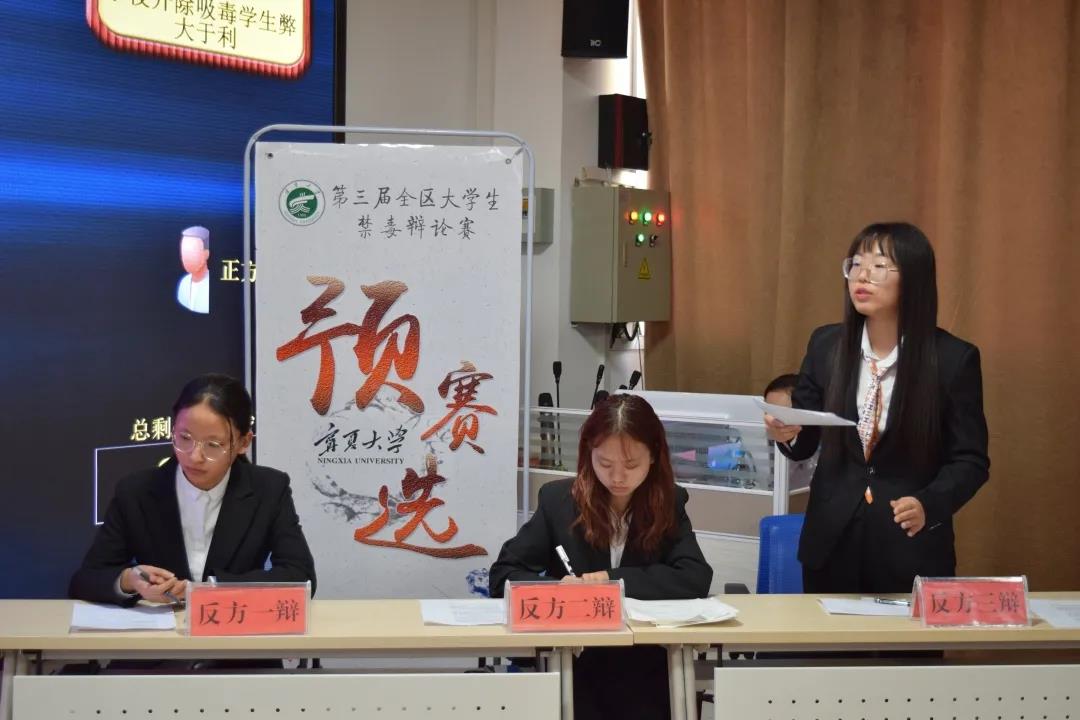 5月26日下午,437437必赢国际网址于文萃校区法治教育基地举办437437必赢国际网址禁毒辩论赛暨第三届全区大学生禁毒辩论赛预选赛复赛、决赛。437437必赢国际网址演讲与辩论社教练杨雅静、马文静、崔晨曦担任第一场复赛评委,张航溥、吴玲、曹子怡担任第二场复赛评委,张航溥、吴立仙、吴玲担任决赛评委。比赛辩题为“学校开除吸毒学生利大于弊还是弊大于利”。