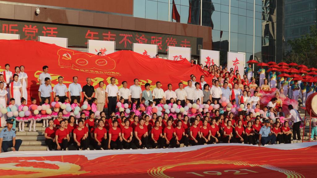 联欢分为党旗颂、“五育并举”育新人、坚定信念跟党走三部分,将歌舞、戏曲、武术等多种表演形式加以融合,在教育系统工作者和青年学生的生动演绎中,深情回顾了自治区教育系统在党的坚强领导下取得的卓越成就,展示出新时代教育工作者和青年学生发自肺腑感党恩、矢志不渝听党话、坚定不移跟党走的决心。虽身处炎炎烈日之下,但演出人员的热情丝毫未减,精彩绝伦的表演引起在场群众的强烈共鸣,联欢现场气氛热烈,掌声欢呼声经久不息。最后,在演员们“祝愿伟大祖国繁荣昌盛,祝福伟大共产党生日快乐”的欢呼声中,室外联欢部分圆满结束。全体演职人员同现场观看演出的领导合影留念。