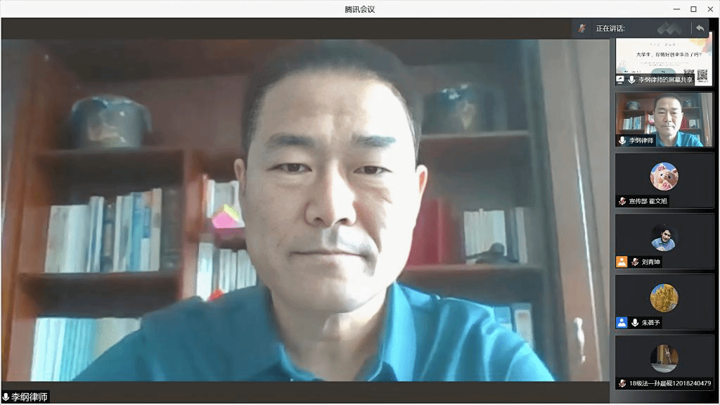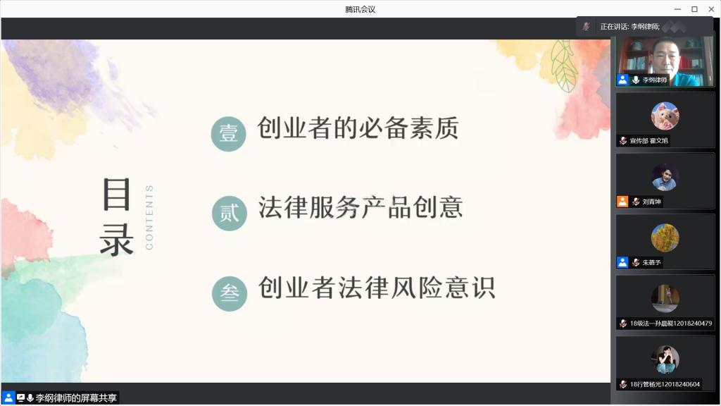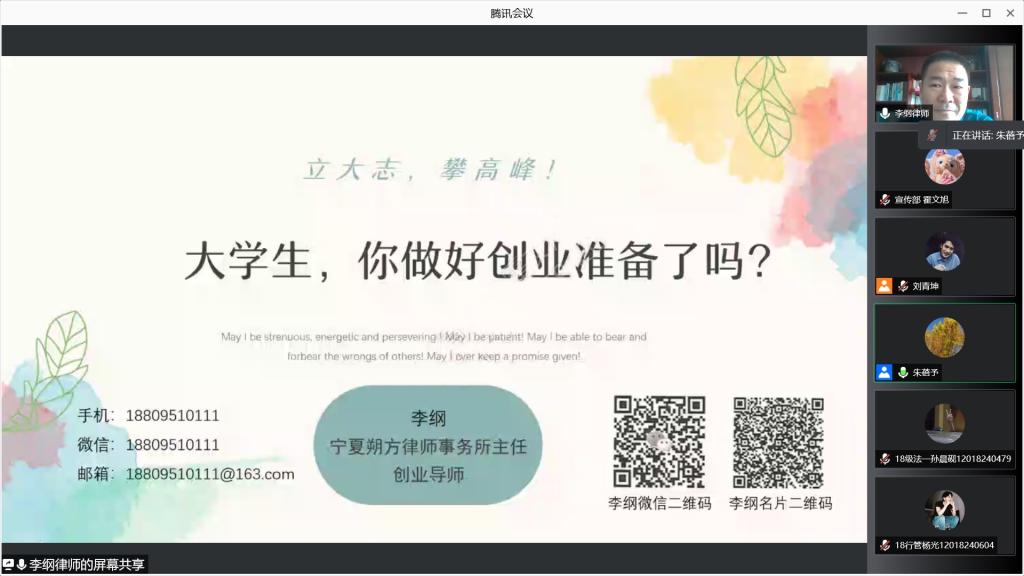 为深化高校素质教育,培养同学们的创新思维,帮助同学们挖掘创业潜能、掌握创业知识、实现创业梦想,11月20日下午,437437必赢国际网址组织开展“大学生,你做好创业准备了吗?”主题线上讲座。本次讲座特邀宁夏朔方律师事务所主任、宁夏律师协会副秘书长李纲律师主讲,法律系主任朱蓓予及2018级全体本科生参加。