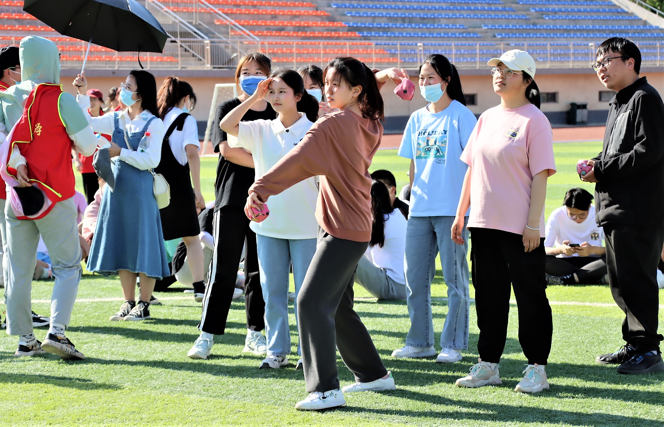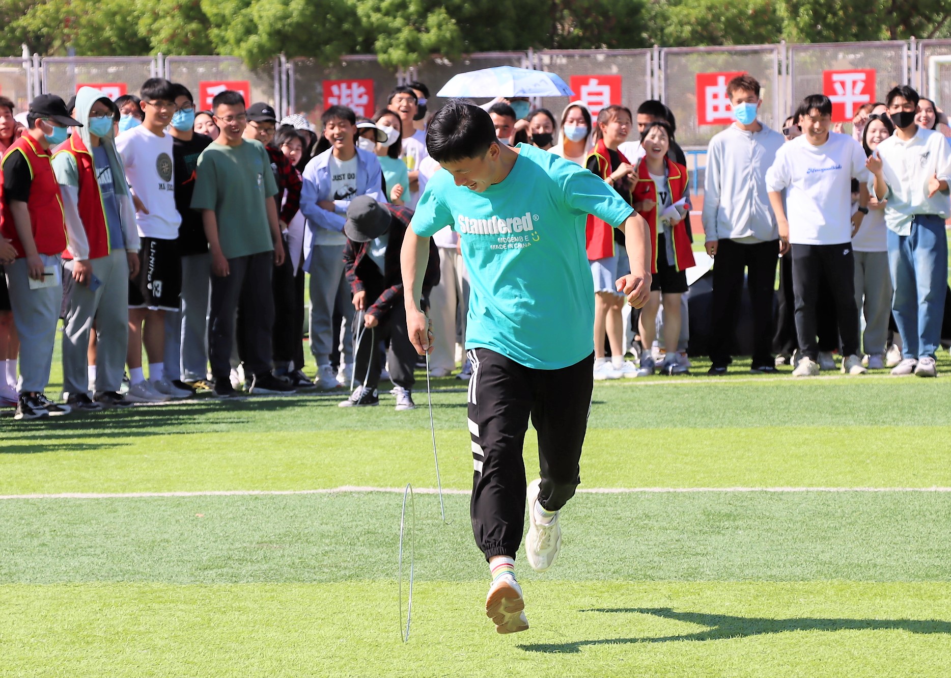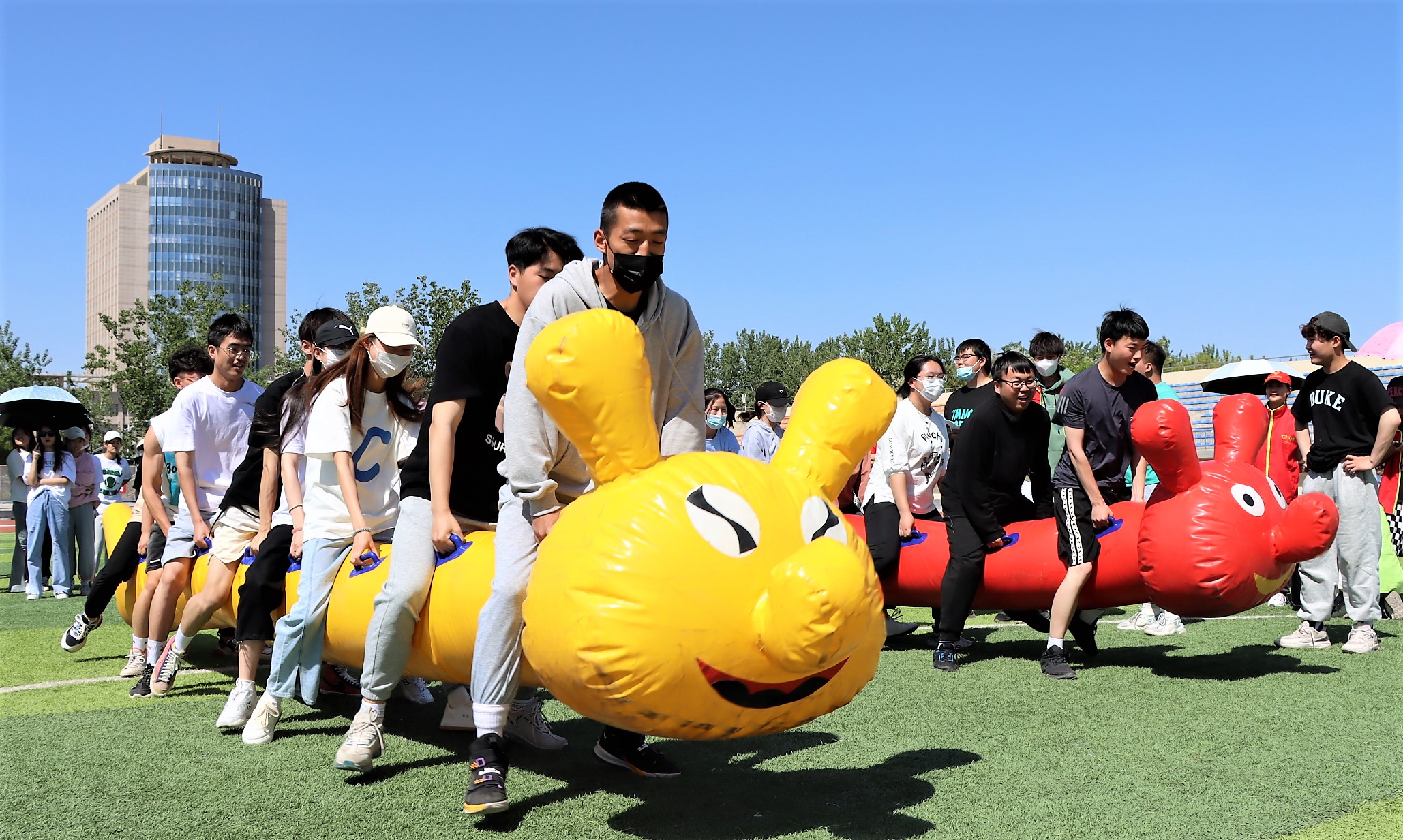 五月初,夏日的骄阳已初显头角,但炎炎烈日难挡学生们洋溢的青春和火热的激情。本次趣味运动会设有八人多足毛毛虫、滚铁环、跳大绳、不倒杆、碰碰球等多个项目,活动现场气氛热烈,既有技巧与能力的竞争,又有团队合作精神和默契程度的考验。“不倒杆”项目考验着选手们的技巧与耐心,是团队合作和个人能力的巨大挑战;堪称童年回忆的“滚铁环”项目,小小的铁环难倒了好多同学;碰碰球项目更是激起一阵欢声笑语,选手们穿戴好碰碰球和护膝等保护设备,在草坪上激烈碰撞着,稍不留意就被撞得人仰马翻。观众们的视线都被赛场情况所牵动,现场的欢笑声、喝彩声此起彼伏。