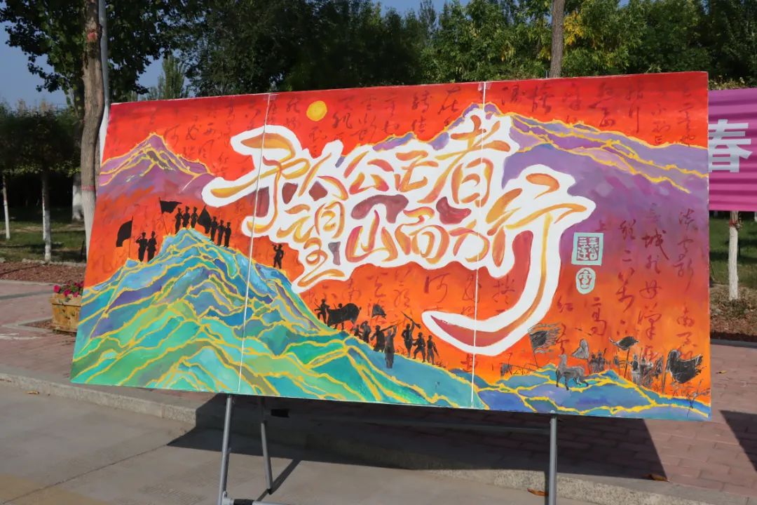 深红的底色震撼人心,草书书写着毛主席的诗文,体现了我们对一个革命时代底色的理解。画面中巍峨的贺兰山雄据云间。前景是从古到今的军人剪影由低到高排开,千年前,将士们捧浊酒一杯于贺兰山勒马,在烽火狼烟里执戟持刃,在玉门的羌笛声里书写着封狼居胥的辉煌,谱画着保家卫国的壮歌;百年前,战士们在暴风骤雨里拼斗疆场,用血肉与热血构筑起华夏民族的长城,用青春与生命换取了华夏的全新天地;时代的考题已经列出,我们的答卷正在写就,峥嵘过去已经彪炳史册,璀璨当下正在不断延伸,光明未来需要我们的踏实开拓。