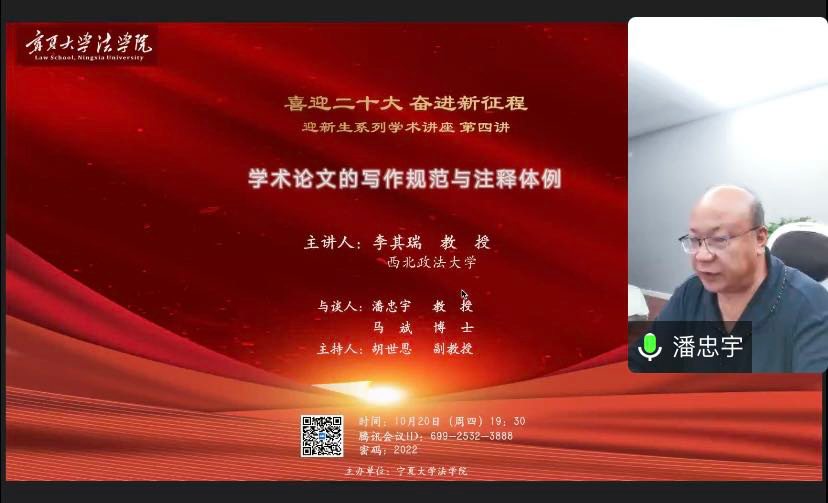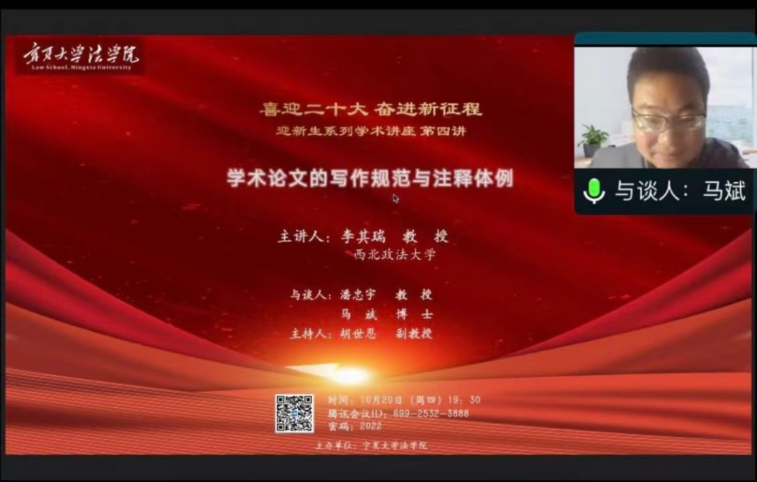 10月20日晚7:30,学术讲座第四讲围绕“学术论文的写作规范与注释体例”展开。本次讲座特邀西北政法大学法治文化研究中心主任、马克思主义法学研究所所长李其瑞教授担任主讲嘉宾,必赢副院长胡世恩主持,潘忠宇教授、马斌博士出席并担任与谈嘉宾。