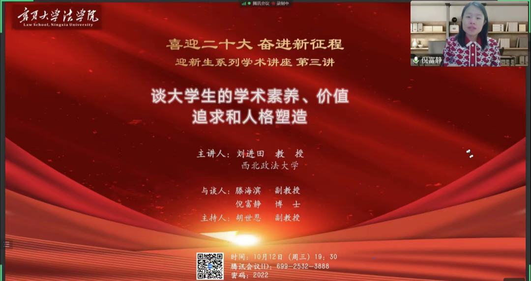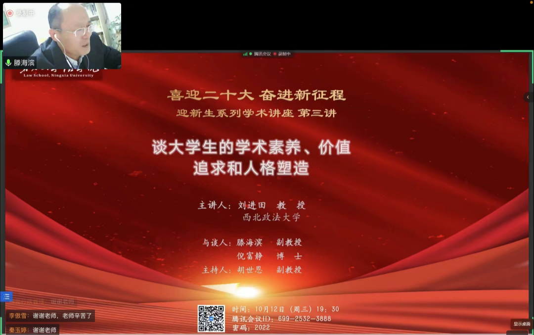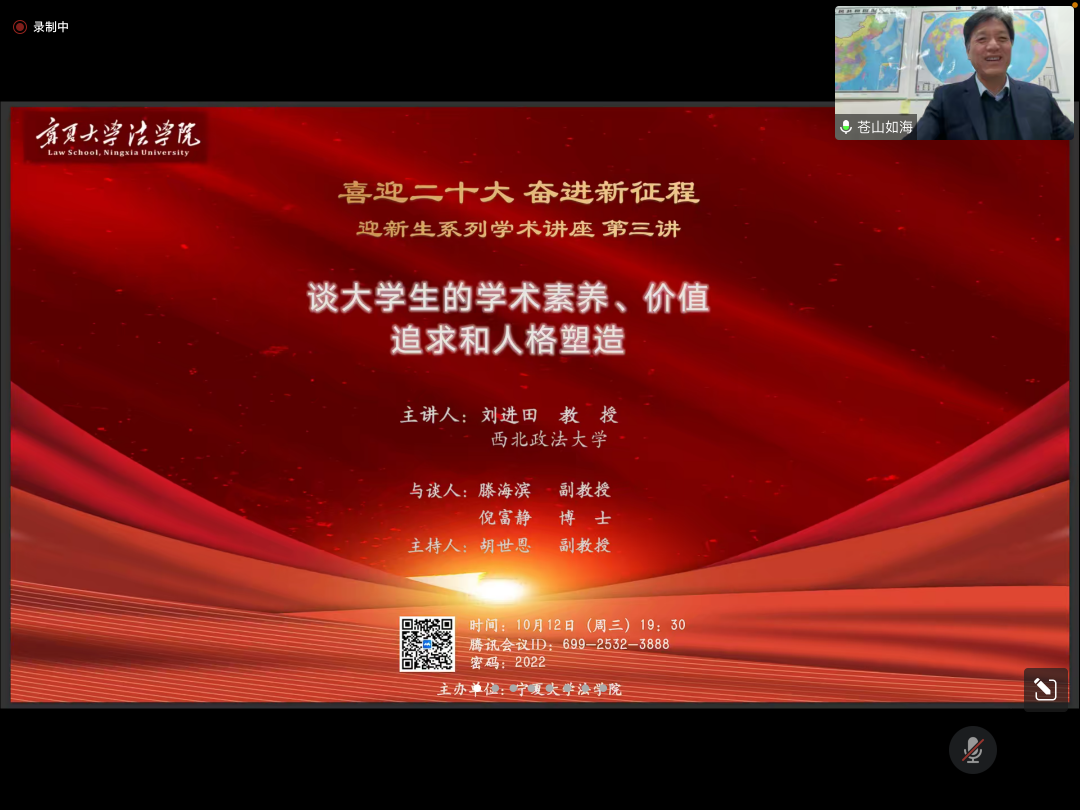 10月11日晚7:30,必赢特邀西北政法大学文化与价值哲学研究院院长刘进田教授带来题为《谈大学生的学术素养、价值追求和人格塑造》的线上讲座。本次讲座由副院长胡世恩主持,滕海滨副教授和倪富静博士为与谈人。