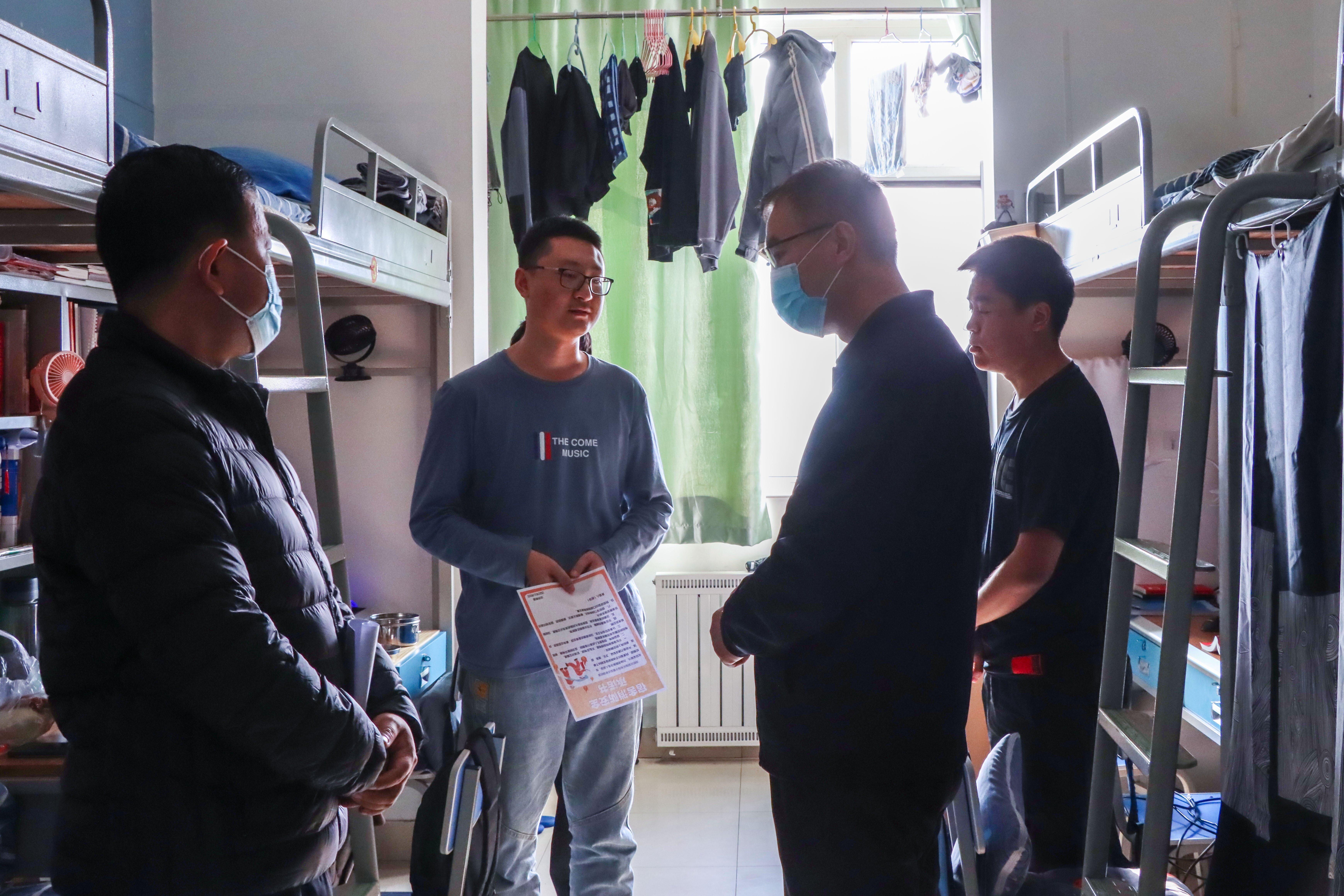 荷尽已无擎雨盖,菊残犹有傲霜枝。随着冬季的到来,宿舍消防安全显得尤为重要。为了提高同学们的安全意识和自我管理意识,引导学生养成良好的卫生习惯和安全用电习惯。11月9日中午,学院党委书记李治涛、副书记杨扬、辅导员付晓晨深入贺兰山校区学生宿舍进行规范检查和安全教育。