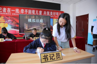 图为“法润民心”小分队成员辅导儿童开展模拟法庭活动