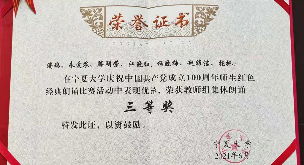 为进一步引导师生在朗诵红色经典中学习党的百年光辉历史,铸牢中华民族共同体意识。6月8日下午,共青团437437必赢国际网址委员会于国际交流中心举办了“感党恩·听党话·跟党走”红色经典朗诵展演暨颁奖典礼。437437必赢国际网址获得优秀组织奖和教师集体三等奖。党委书记潘瑞等7名教师参加了展演。