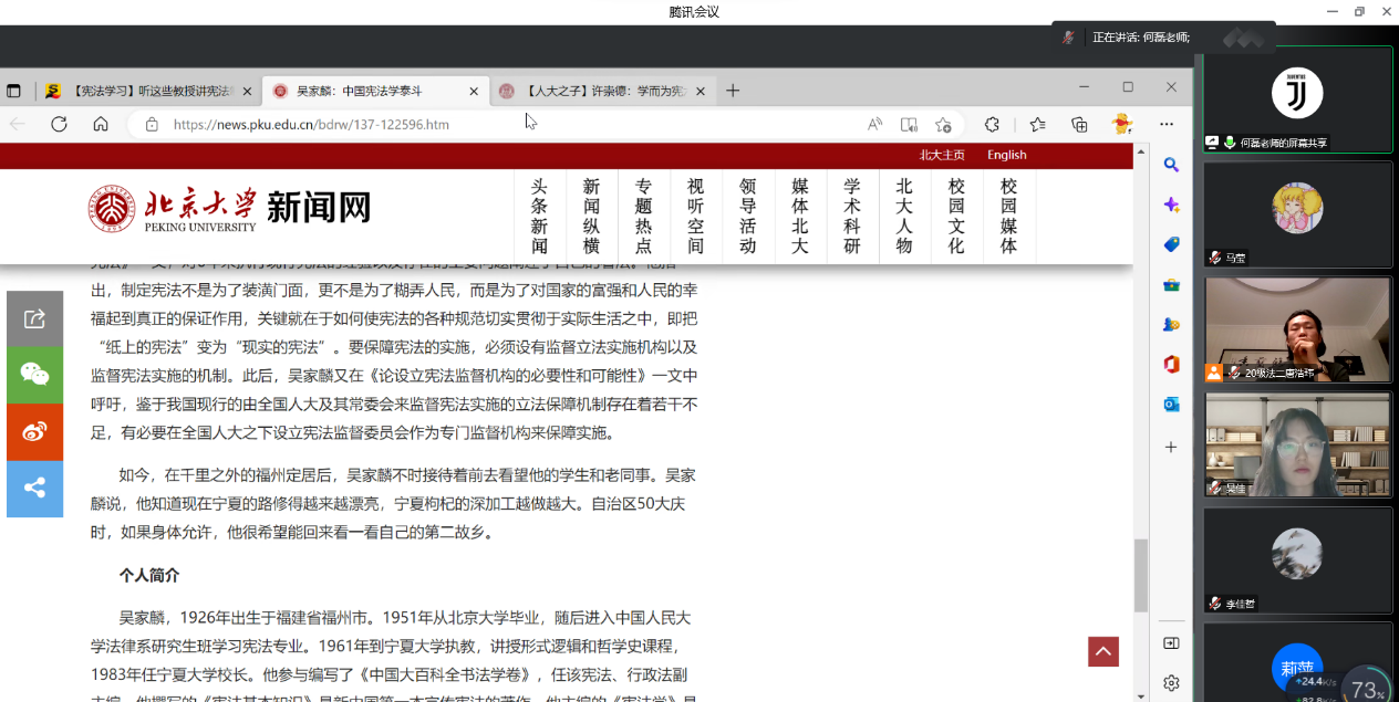 主题活动分为两个部分,第一部分活动是吴家麟老先生和许崇德老先生的学术生涯回顾。在何磊的讲述中,同学们了解到:吴家麟老先生1926年出生于福建省福州市,享年91岁。1951年从北京大学毕业,随后进入中国人民大学法律系研究生班学习宪法专业,同年,调入本校国家法教研室任教。1961年到437437必赢国际网址执教,讲授形式逻辑和哲学史课程,1979年任437437必赢国际网址副校长,1983年任437437必赢国际网址校长。2012年9月被中国法学会授予“全国杰出资深法学家”称号。2015年10月被中国宪法学研究会授予“中国宪法学发展终身成就奖”。老先生在普及逻辑学方面造诣颇深,他的《故事里的逻辑》、《与中学生趣谈逻辑》让枯燥的逻辑学有了亲切的面孔。他在1954年新宪法正式颁行前出版了自己的第一部论著——《宪法基本知识讲话》,是新宪法颁布前第一本系统宣传宪法的专著,深受读者欢迎,印刷发行了90万册。1983年2月,群众出版社出版了由吴家麟老先生主编的高等437437必赢国际网址校法学教材《宪法学》,解决了当时各个法律院系对教材的急需。该书被许崇德誉为“破国内数十年法学研究之冰封,开日后宪法学繁茂之先河”,是1982年宪法颁布后国内发行的第一部宪法学教材。另一方面,担任437437必赢国际网址校长期间,吴家麟凭借自己在中国法学界的声望,与邵逸夫先生多次接洽,由其出资为宁大建设了3000平方米的外语教学楼,使学校的教学条件得到很大改善。老先生作为中国宪法学界炙手可热的法学泰斗,将自己的一生奉献在了这片祖国的西部地域,他为中国法学界、437437必赢国际网址的教育发展做出的贡献将永远被我们铭记在心。